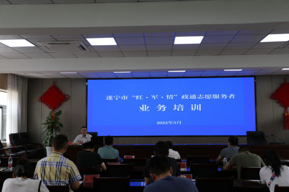 为进一步提升全市退役军人服务保障领域志愿服务水平和能力,5月7日,遂宁市退役军人服务中心组织召开遂宁市“红·军·情”政通志愿服务队志愿者业务培训会。市退役军人局党组成员、市退役军人服务中心主任舒天忠出席,服务队46名志愿者参加培训。