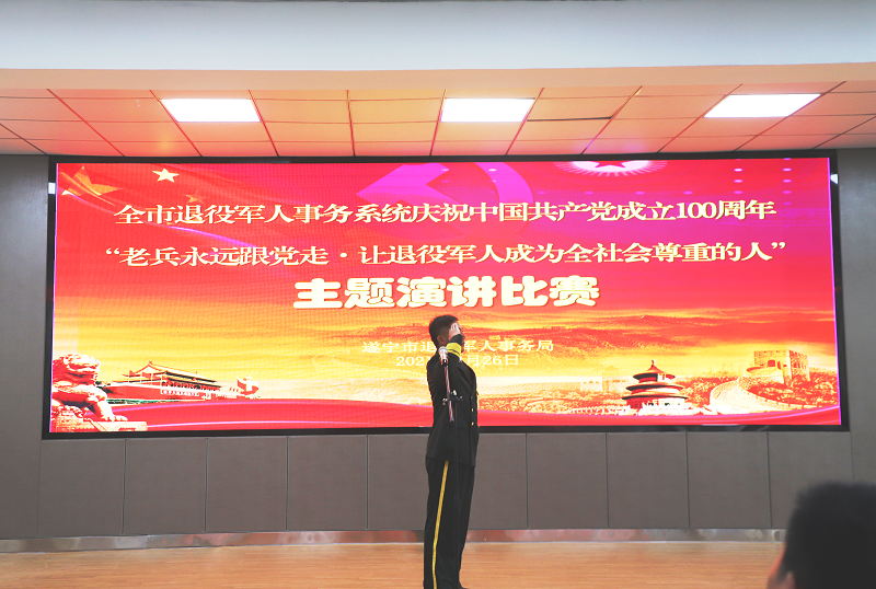 此次主题演讲比赛,是遂宁市退役军人事务局庆祝建党100周年系列活动和贯彻落实退役军人事务厅开展“永远跟党走”系列庆祝活动的重要组成部分。遂宁市退役军人事务局广泛发动、积极宣传,充分展示了全市广大退役军人一心向党、奋发有为的精神风貌,努力营造关心、关爱、尊崇军人的良好社会氛围。