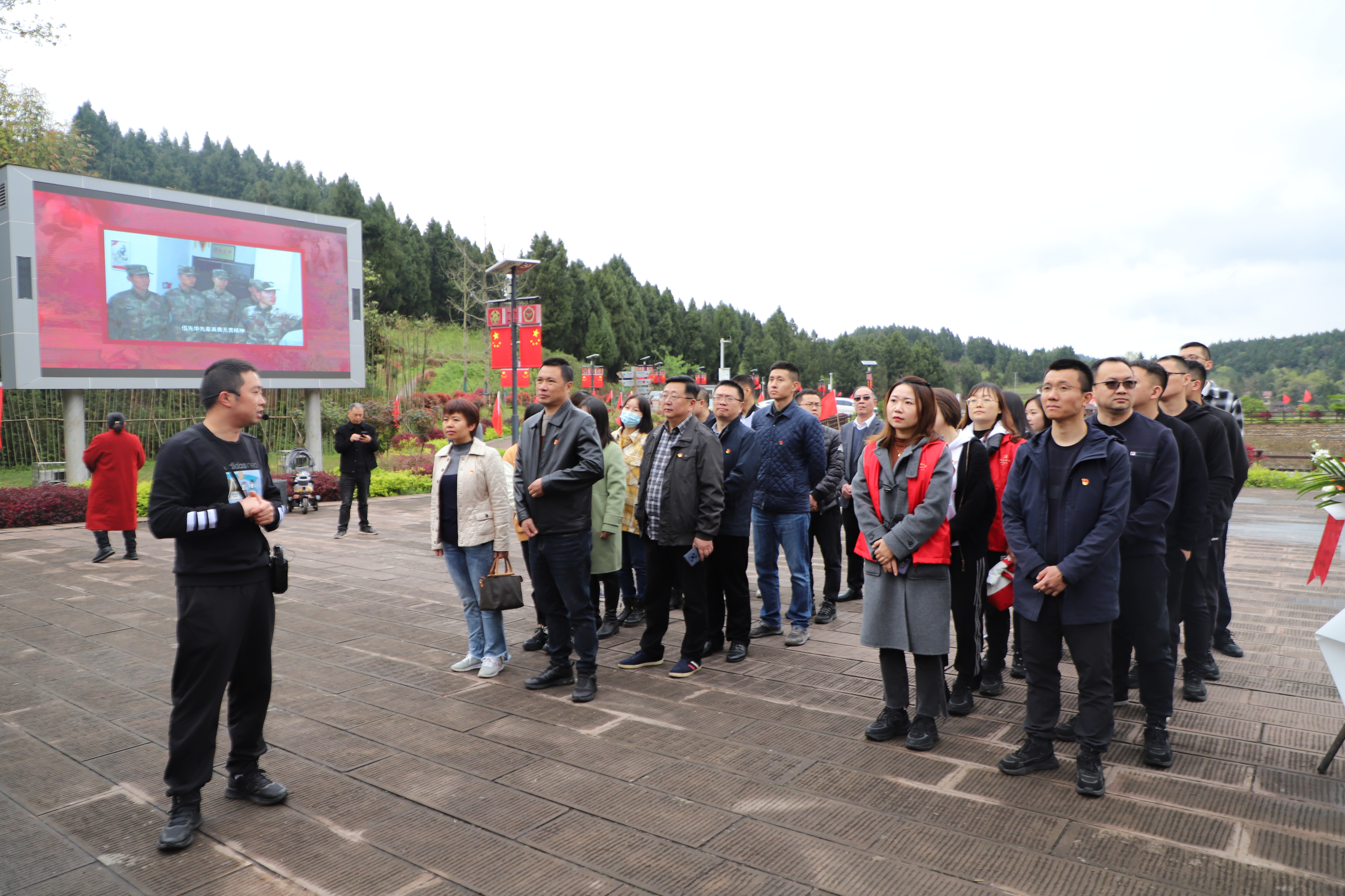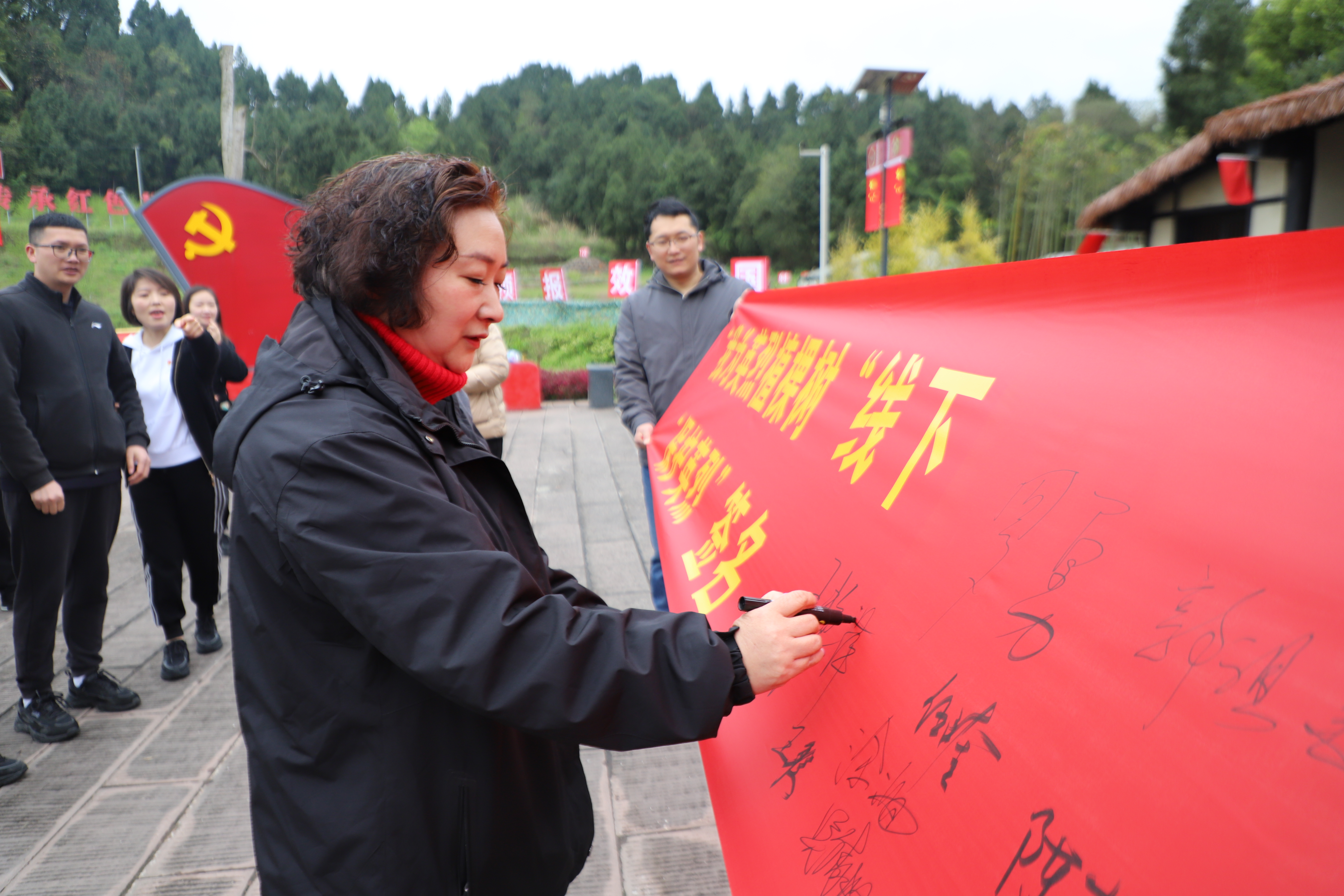 缅怀活动中,大家在英烈故居中央广场面向伍先华烈士铜像整齐列队,庄严献花默哀,深情追思伍先华烈士。随后,纷纷拿起笔在保护英烈签名征集横幅上留下了自己的名字。