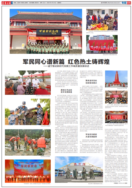 习近平总书记强调:“新形势下,双拥工作只能加强、不能削弱。”从历史深处走来的遂宁,正以军民同心的磅礴之力,锚定建军一百年奋斗目标,持续擦亮双拥品牌,让军政军民团结之花在涪江两岸常开长盛,为实现强国强军梦贡献出更多遂宁力量。