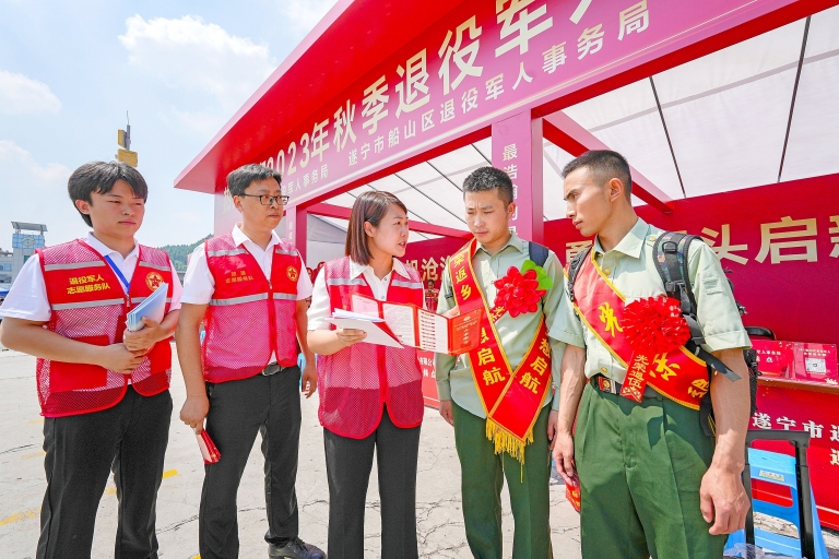 9月2日,为迎接2023年秋季退役军人光荣返乡,船山区退役军人事务局的志愿者在遂宁火车站出站口,为退役军人发放回乡办事流程卡、办事联络卡和就业创业手册等,帮助退役军人顺利完成军地过渡,尽快转换角色,融入家乡发展。 全媒体记者 刘昌松 摄