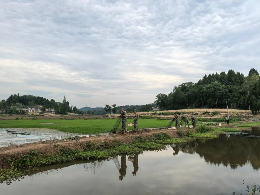 站在高处远眺,稻虾田如碧云镶嵌,油菜田似金浪翻滚。当一朵朵金色的希望点缀在无际的田野,民兵助力的乡村振兴生机盎然。