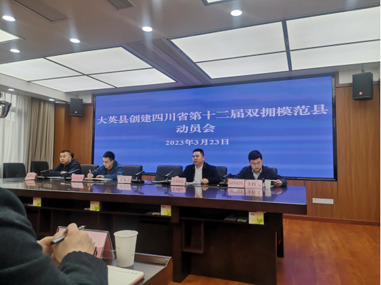 3月23日,大英县召开创建四川省第十二届双拥模范县动员会。动员全县上下统一思想、坚定信心、强化措施、落实任务、全力争创四川省第十二届双拥模范县。县双拥工作领导小组成员单位及相关单位、驻县部队、各镇(街道)分管负责同志共60余人参加会议。