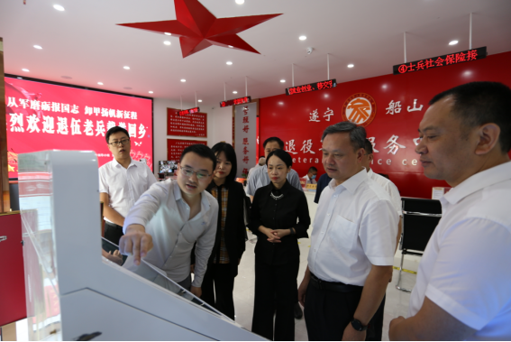 在船山区,陈发清实地察看了船山区退役军人服务中心、龙凤镇退役军人服务站。通过查看资料、观看视频等形式,详细了解了船山区退役军人服务体系建设、思想政治教育、移交安置、就业创业扶持等工作,对迎接退役士兵光荣返乡、“一体化”服务试点和精品退役军人服务站建设、践行新时代“枫桥经验”建立“3+N+X”矛盾纠纷多元调节机制等工作给予了充分肯定。
