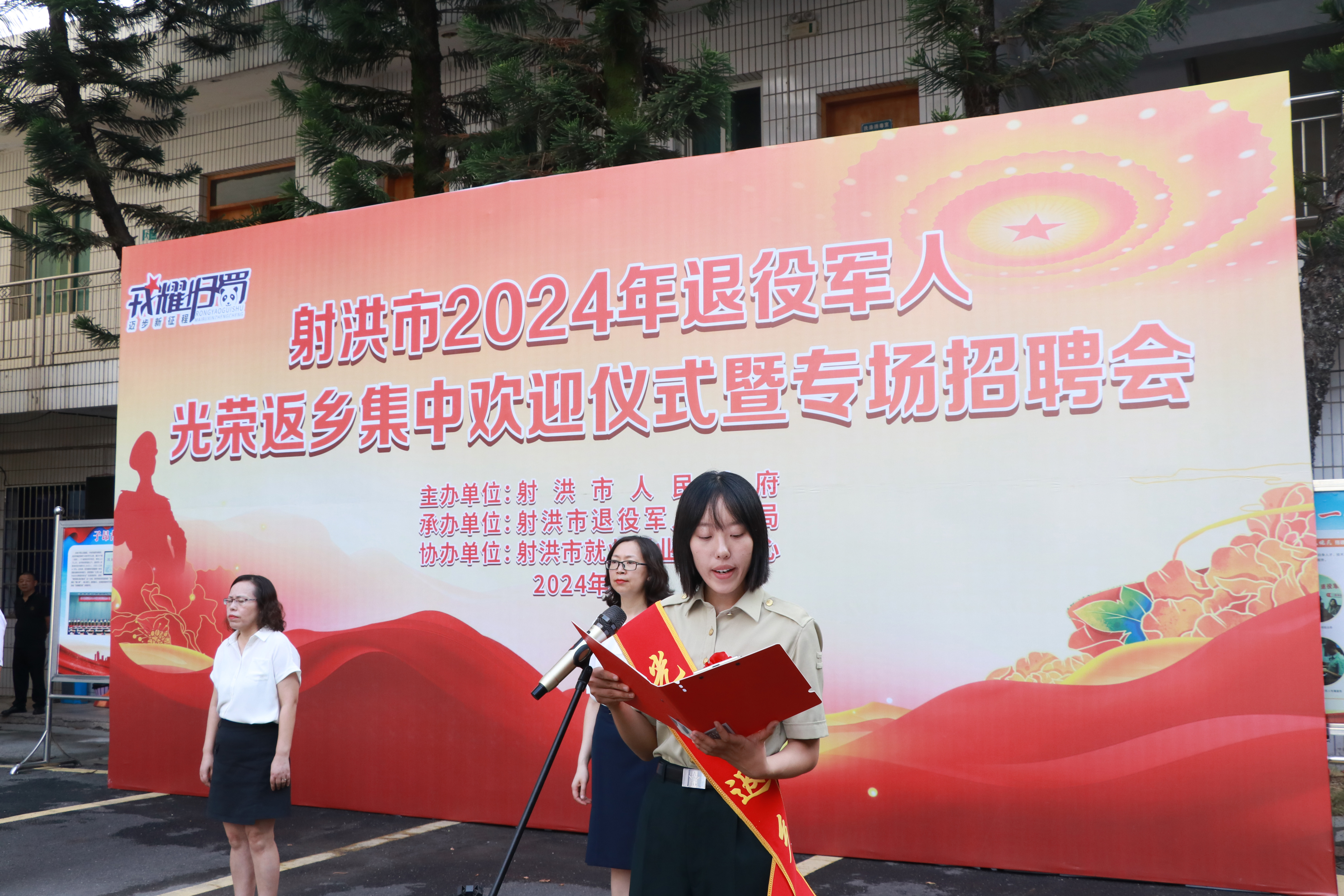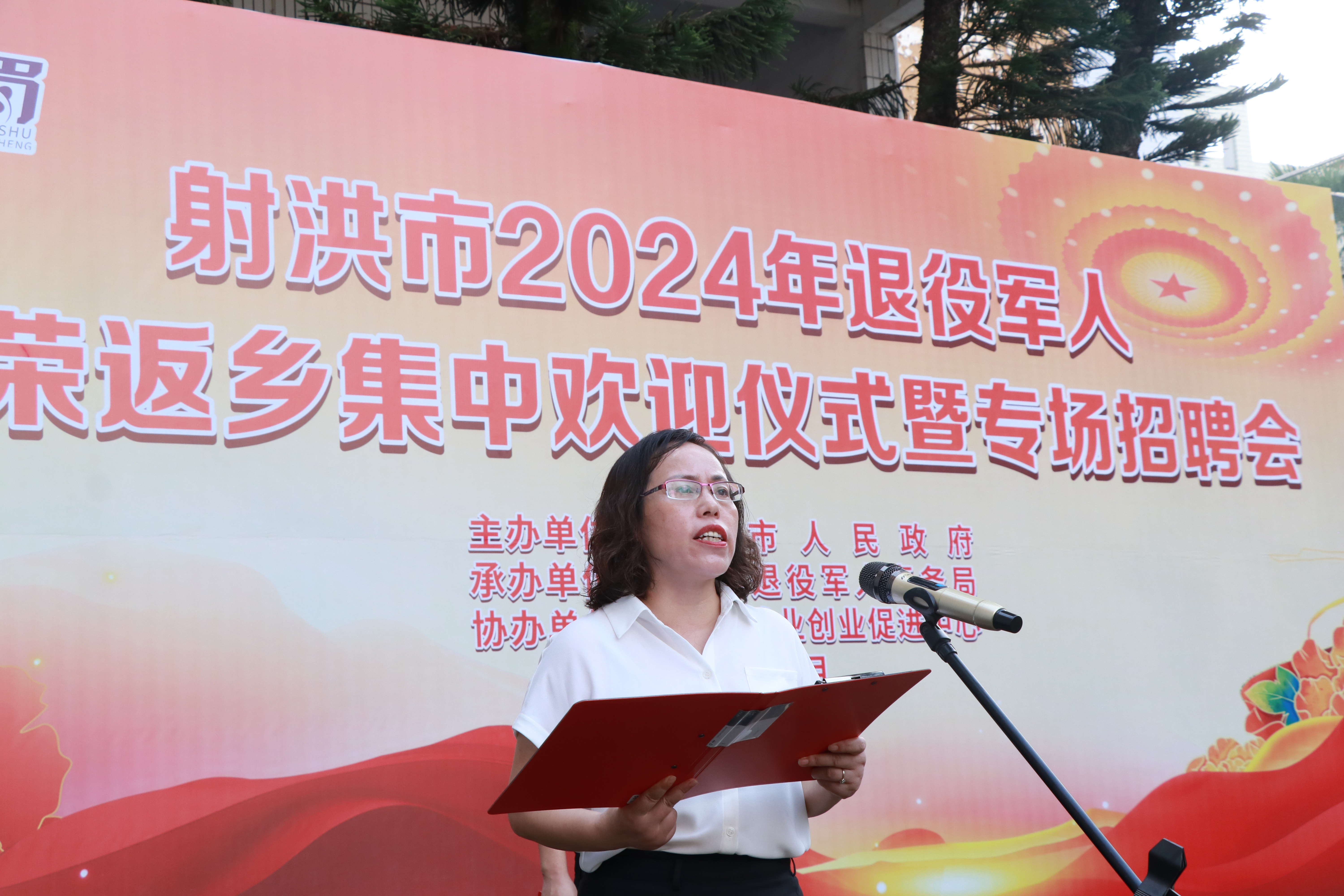 金秋送爽,硕果累累。9月11日,射洪市2024年秋季退役军人光荣返乡集中欢迎仪式暨专场招聘会在射洪市退役军人事务局举行。市退役军人事务局党组书记、局长李琪出席仪式并讲话。市双拥办部分成员单位、退役军人服务站、拥军企业及家属参加,现场气氛热烈。