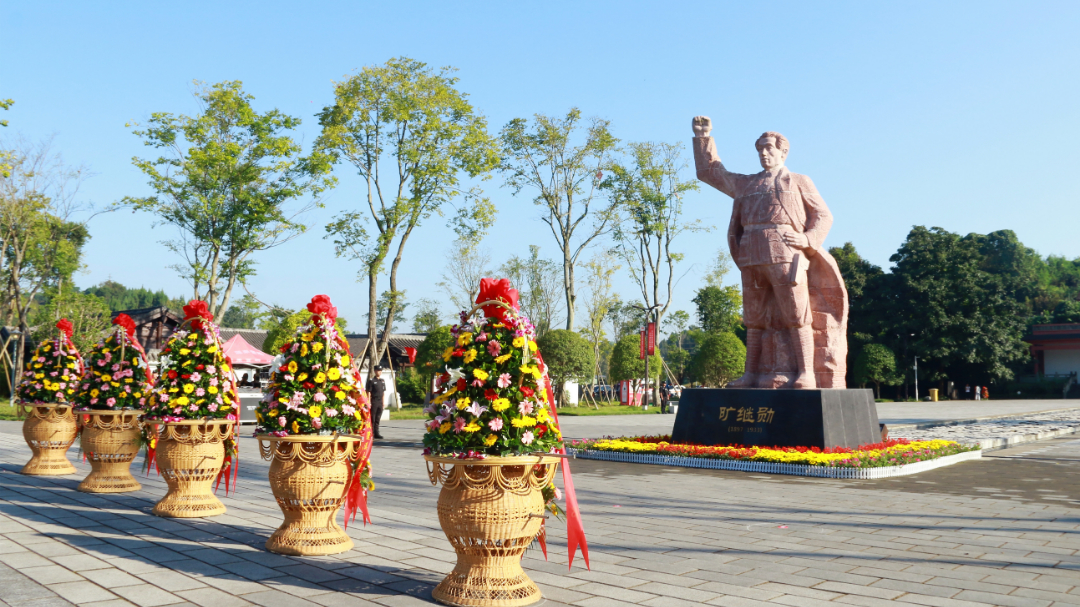 上午9时许,革命烈士旷继勋纪念馆广场上一片静穆。花篮整齐摆放在旷继勋烈士雕像前,红色缎带上写着“革命烈士永垂不朽”。