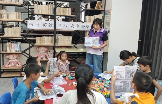 卓筒井镇干屏村的“童伴妈妈”尹平,在村童伴之家组织留守儿童开展《抗日英雄绘本故事》分享会,给孩子们讲述了《狼牙山五壮士》《雪原英雄杨靖宇》等红色故事,带领孩子们齐声合唱红色经典歌曲《歌唱祖国》,引导孩子们学习革命先烈的英勇事迹,让爱国的种子深深植入孩子们幼小的心里。