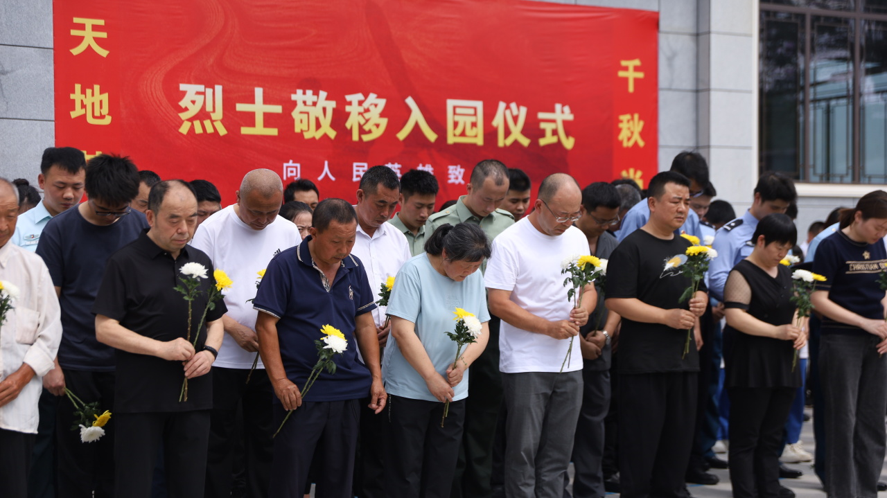 伴随着深沉低婉的《思念曲》,礼兵缓步护送烈士灵柩放置于灵台上,在奏唱国歌、宣读烈士评定文件并介绍烈士生平事迹、默哀后,烈士棺椁被移至安葬区。参加仪式的市区两级相关领导、烈士亲属、干部职工、师生、公检法、退役军人代表,以及社会各界人士依次向烈士敬献鲜花,缅怀先烈、寄托哀思。