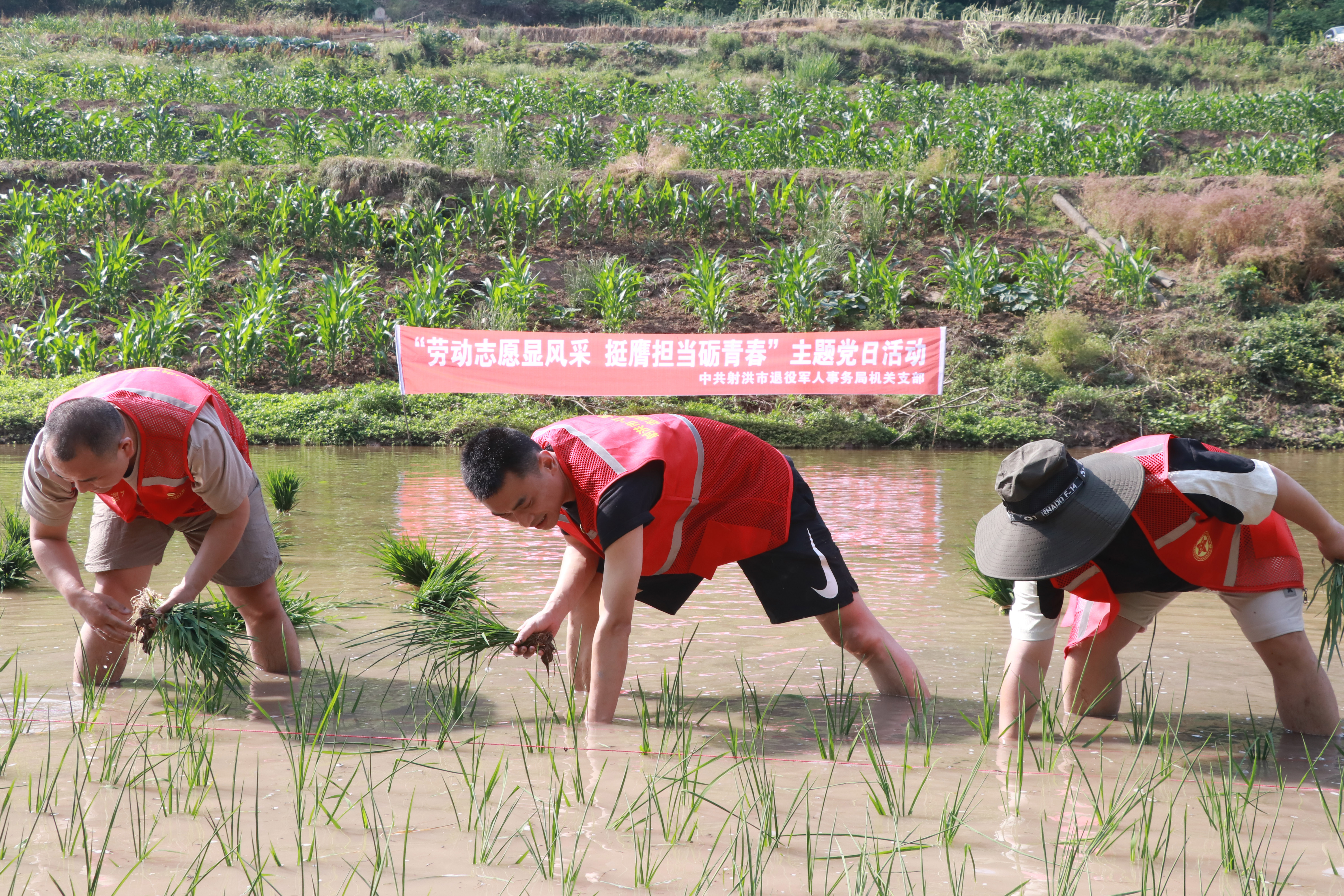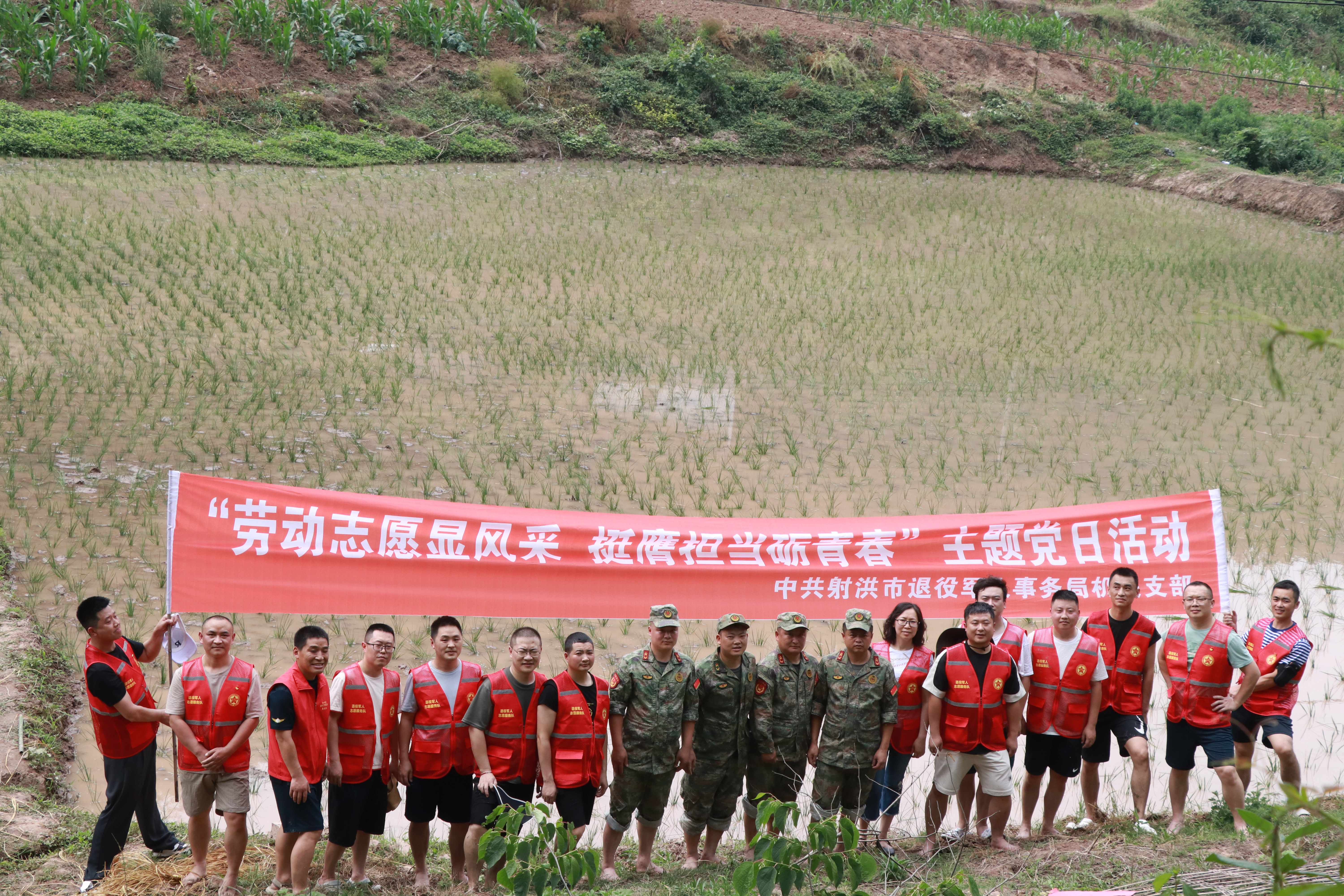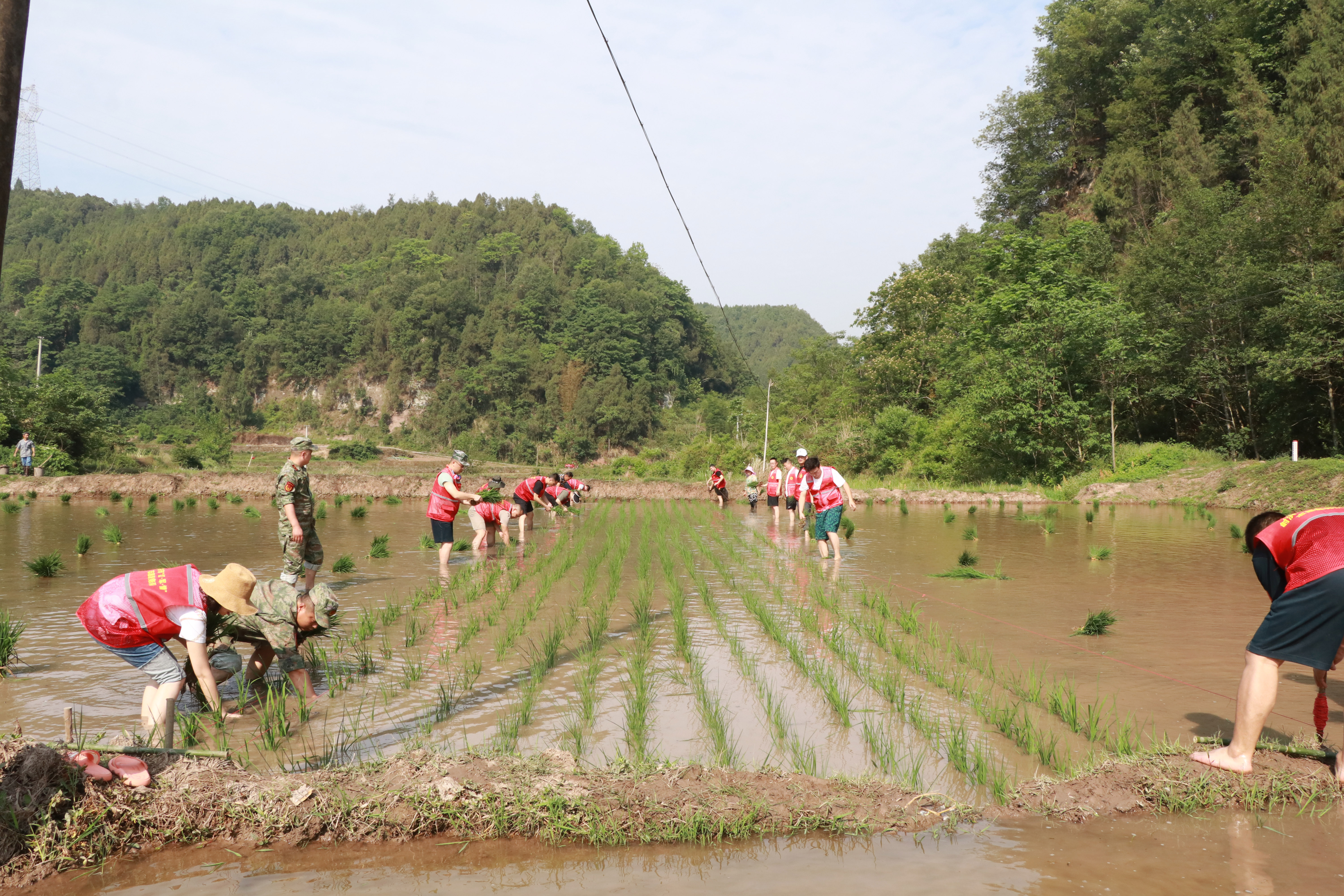 在退役老兵李长刚的责任田里,党员同志们佩戴党员徽章,身着红马甲,在老李指导下学习插秧技巧,大家顶着烈日,鼓足干劲,分组合作,集体“扎”进泥泞的水田里,大战红五月。经过一上午的辛勤劳动,一排排嫩绿的秧苗在水田里铺展开来。看着眼前一片充满生机和希望的小苗芽,满身泥水的党员们深深地体会到种田的艰辛以及粮食的来之不易。