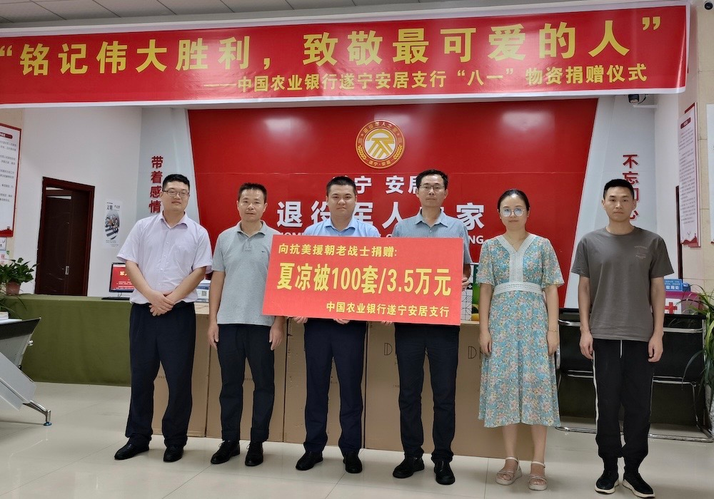 在三家镇,农行遂宁安居支行走访慰问了抗美援朝老兵周纯和龚云福,为他们送去凉被、整套抗美援朝定制邮票等慰问物资和慰问金,详细询问了老人家的生活和身体状况,认真聆听他们的光荣事迹、追忆那段荡气回肠的烽火岁月,向他们敢于斗争、不怕牺牲的革命精神致以崇高的敬意。