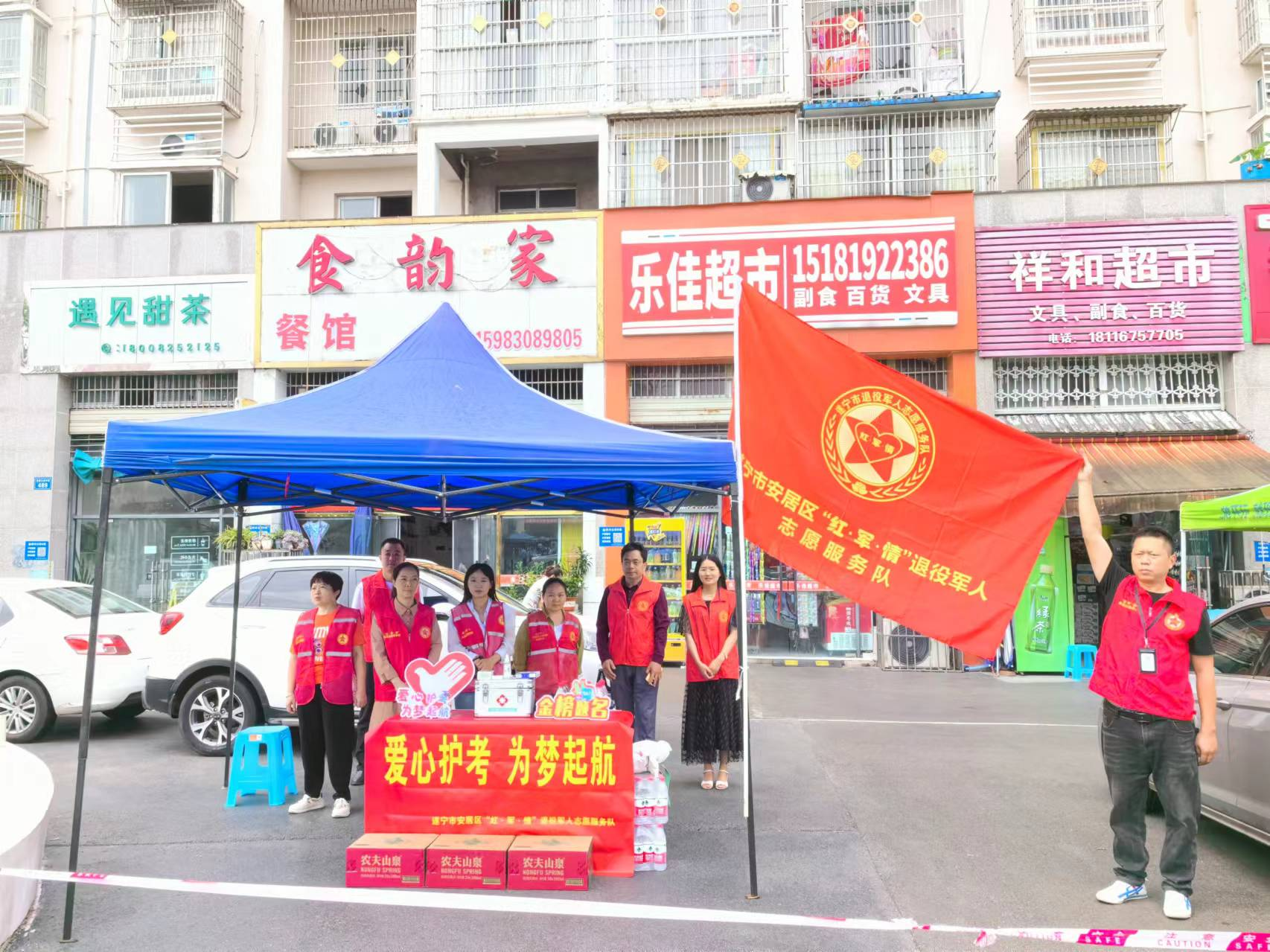 在育才中学考点,退役军人志愿者们早早在门口,开展交通疏导、安全教育、环境卫生治理等志愿服务活动,全力为考生们提供良好的考试环境。同时,退役军人志愿者们为前来考试的考生和家长们送上矿泉水、防暑药品、雨伞等物品,叮嘱考生们放松心情,考试期间提醒送考的家长们保持安静的外部环境,以实际行动为考生们加油打气、“保驾护航”。