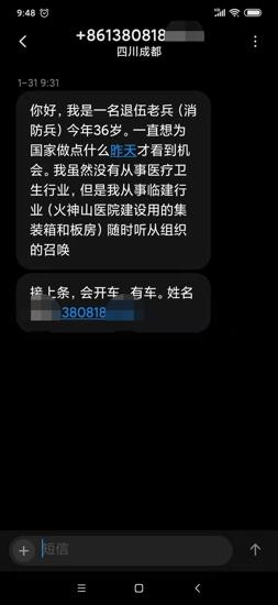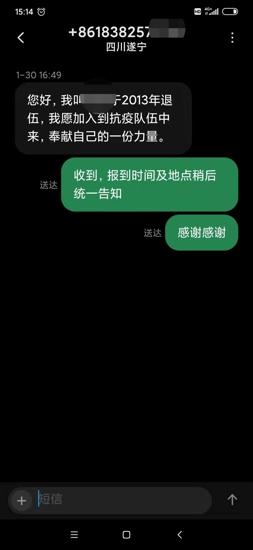 "虽然退伍了,但我还是想为国家做点什么,昨(1月31日)天才看到机会。我虽然没有从事医疗卫生行业,但我会开车,也有车,随时听从组织的召唤。"柳洲告诉记者,作为一名退伍军人,但退伍不褪色,在如此关键的时刻,他们就应该为国家、为社会做点什么。