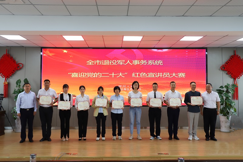 为深入贯彻落实习近平总书记关于“把红色资源利用好、把红色传统发扬好、把红色基因传承好”重要指示精神,5月19日下午,遂宁市退役军人事务系统举办“喜迎党的二十大”红色宣讲员大赛,来自全市各级退役军人事务部门、各企事业单位的15名退役军人和退役军人事务工作者参加了此次比赛。市退役军人局党组书记、局长唐思伦及其他在家局领导参加了活动。