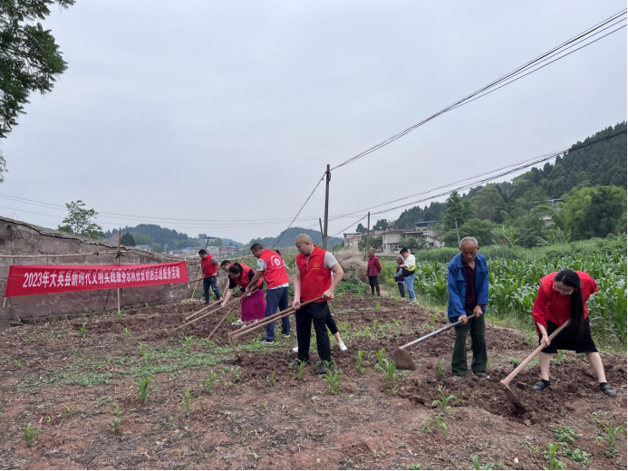 5月26日,大英县退役军人事务局新时代文明实践服务总队走进得鱼沟村开展扶贫帮困志愿服务活动,帮助贫困户翻地松土,减轻劳作负担。