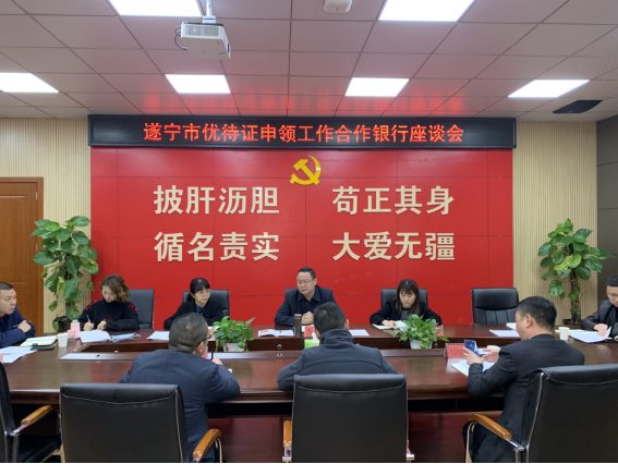2022年3月2日,遂宁市组织召开优待证申领工作合作银行座谈会,市退役军人局党组成员、副局长李刚出席会议并讲话。中国工商银行遂宁分行、中国农业银行遂宁分行、中国邮政储蓄银行遂宁分行分管负责同志及相关工作人员共同参加了此次会议。