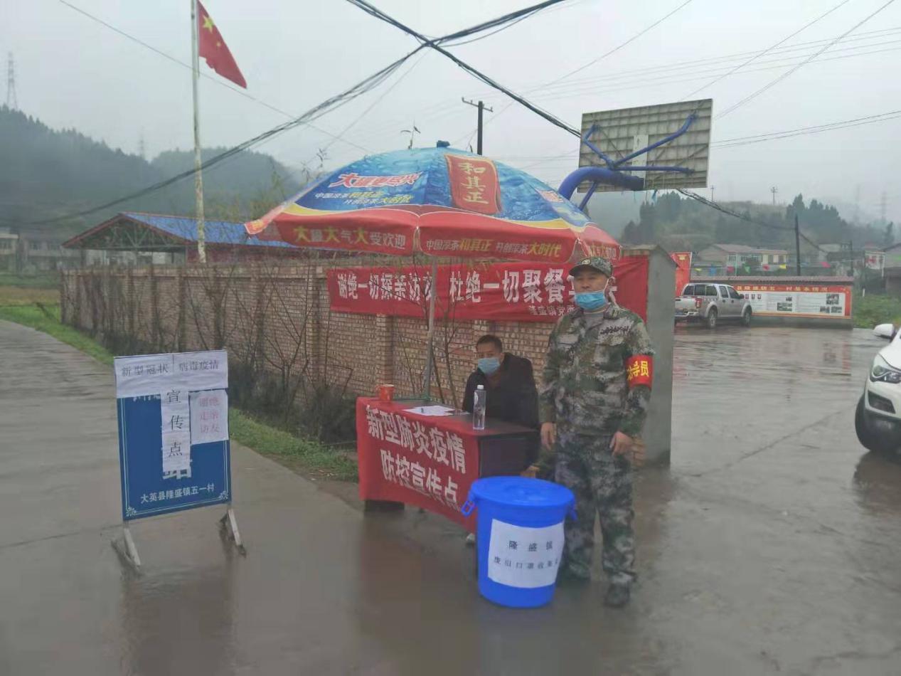在全国新型冠状病毒肺炎严峻形势下,大英县隆盛镇举全镇之力,动员全民力量,不少退役军人、民兵志愿者积极投身抗击疫情一线,以敢打硬仗的坚定信心,坚决打赢疫情防控阻击战,为守护全镇群众生命健康安全再立新功,彰显军人本色。