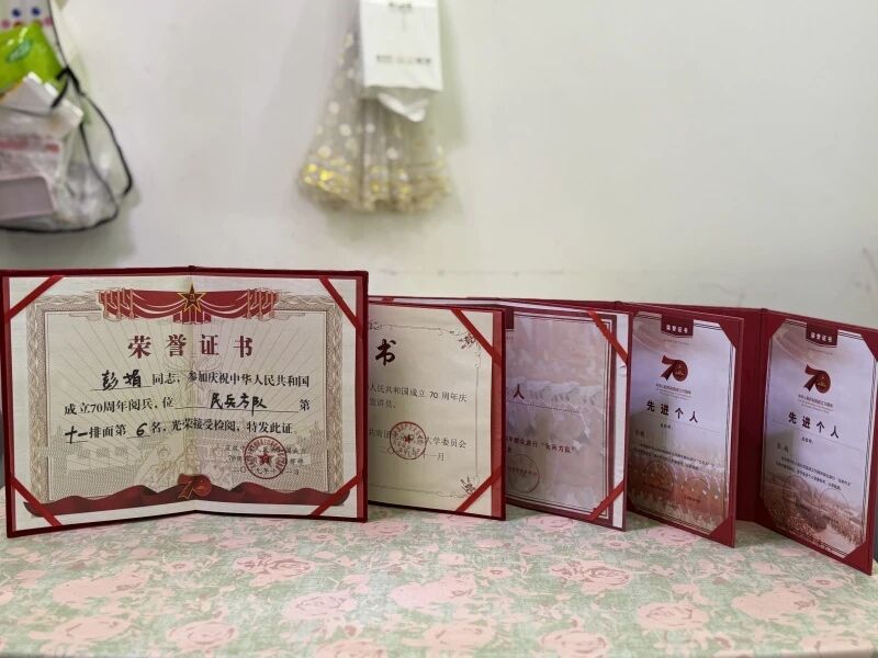 彭娟家人收看阅兵式 “女儿彭娟,我为她骄傲,加油!”9时44分,阅兵分列式拉开序幕。当英姿飒爽的民兵方队女民兵们迈着整齐的步伐走来时,彭娟的母亲舒静激动地指着电视屏幕,眼中满是自豪,一家人也顿时欢呼起来。 彭娟出生于1995年12月。2015年,她以优异成绩考入中国传媒大学播音主持专业。入学1年后,品学兼优的彭娟毅然选择参军报国,在部队历练2年后,她又重返校园完成学业。 彭娟获得的荣誉证书 值得一提的是,在2019年庆祝中华人民共和国成立70周年阅兵式中,彭娟就曾作为民兵方队成员参加过阅兵,6年内2次参加阅兵,这让家人倍感骄傲。 “她读大学的时候就说她的理想是当兵,我说妈支持你。她现在在成都工作,希望她在岗位上再接再厉,为建设国家作出贡献。”舒静告诉记者。