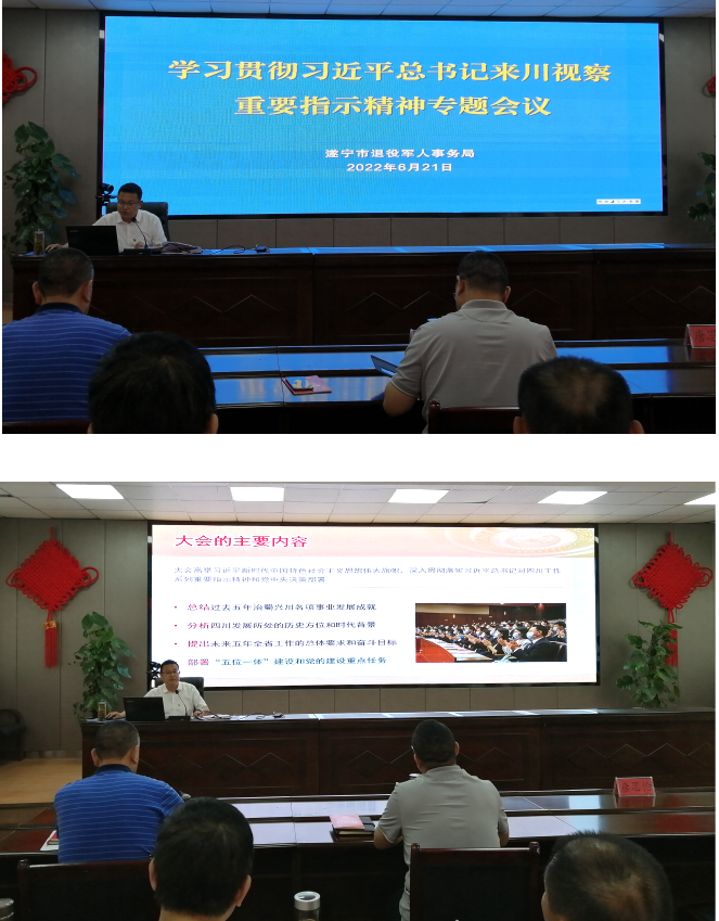 唐思伦同志强调一要把学习贯彻习近平总书记重要指示精神与省第十二次党代会精神结合起来。要深刻把握习近平总书记来川视察和省第十二次党代会召开的重要意义,紧扣“讲政治、抓发展、惠民生、保安全”工作总思路,切实把习近平总书记的深切关怀转化为奋进力量。二要迅速掀起学习习近平总书记来川视察和省党代会精神的热潮。要广泛组织开展学习宣传贯彻习近平总书记来川视察和省第十二次党代会精神活动,通过专题讲座、支部“三会一课”等形式进行学习,切实把相关精神转化为凝心聚力、鼓舞士气、推动工作的强大动力。三要聚焦服务保障主责主业。要着力在优待褒扬、关爱帮扶、退役安置、就业创业、双拥共建等方面下功夫,全面落实退役军人各项政策,推动我市退役军人事务工作高质量发展,为党的二十大胜利召开贡献退役军人事务力量。