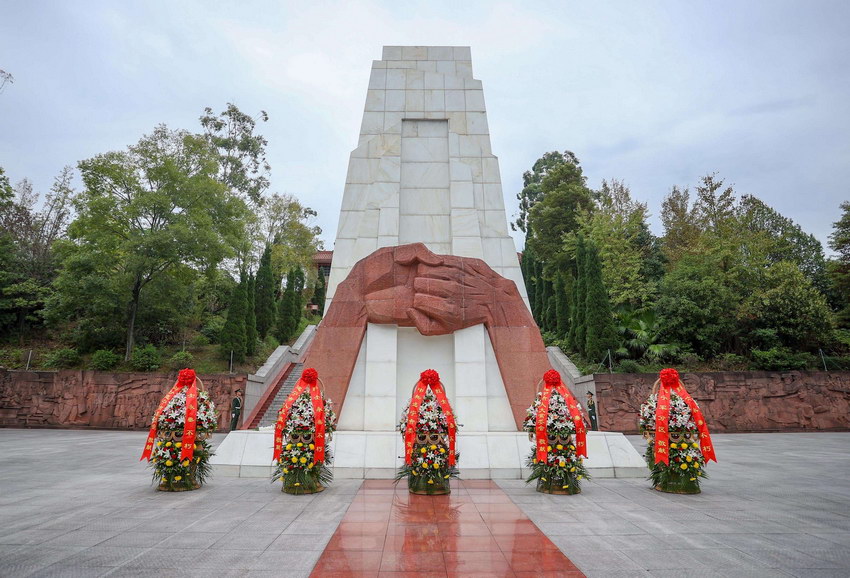 遂宁烈士陵园内,松柏苍翠、庄严肃穆,烈士纪念碑巍然耸立。各界代表手持鲜花、神情庄重,面向纪念碑整齐列队。