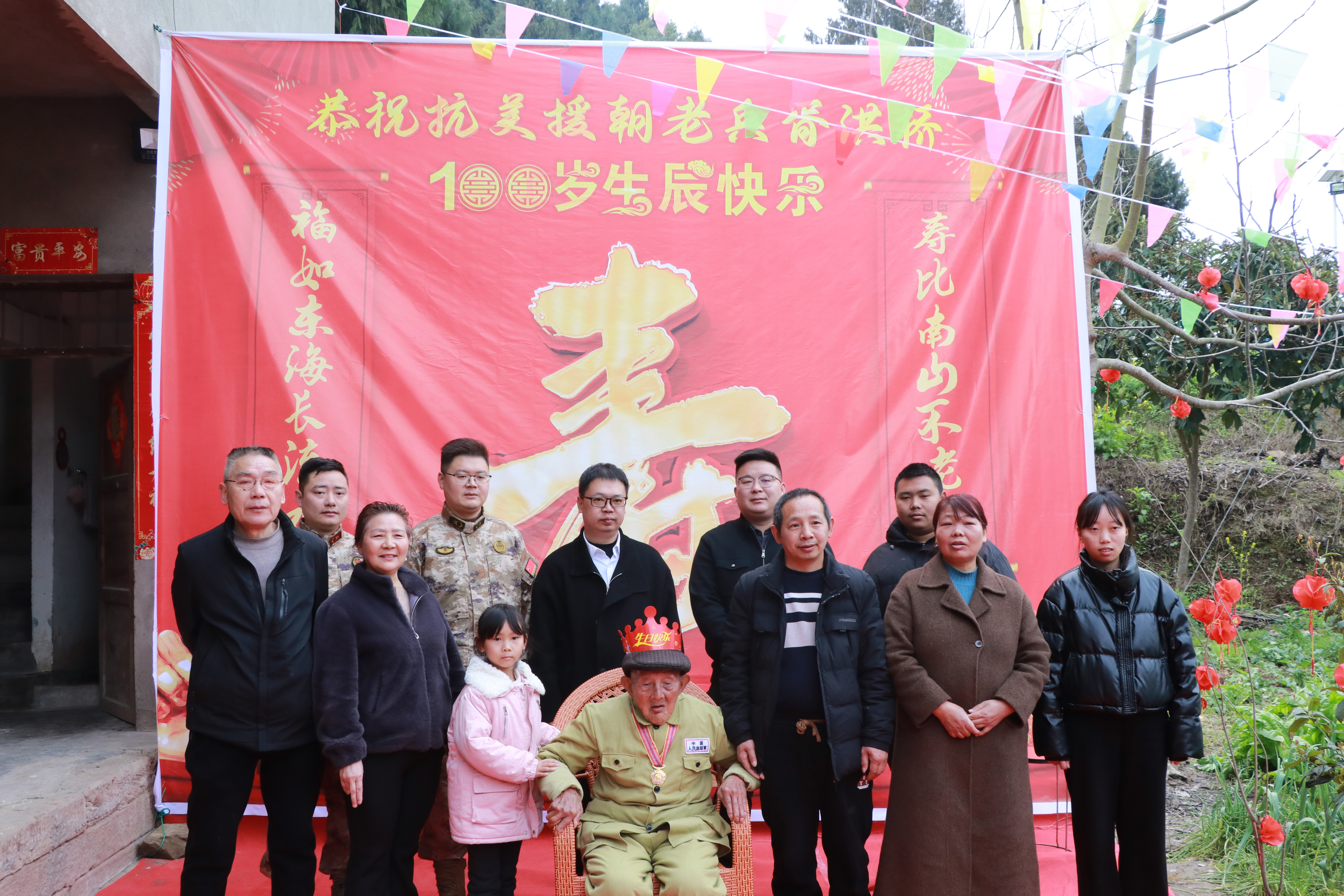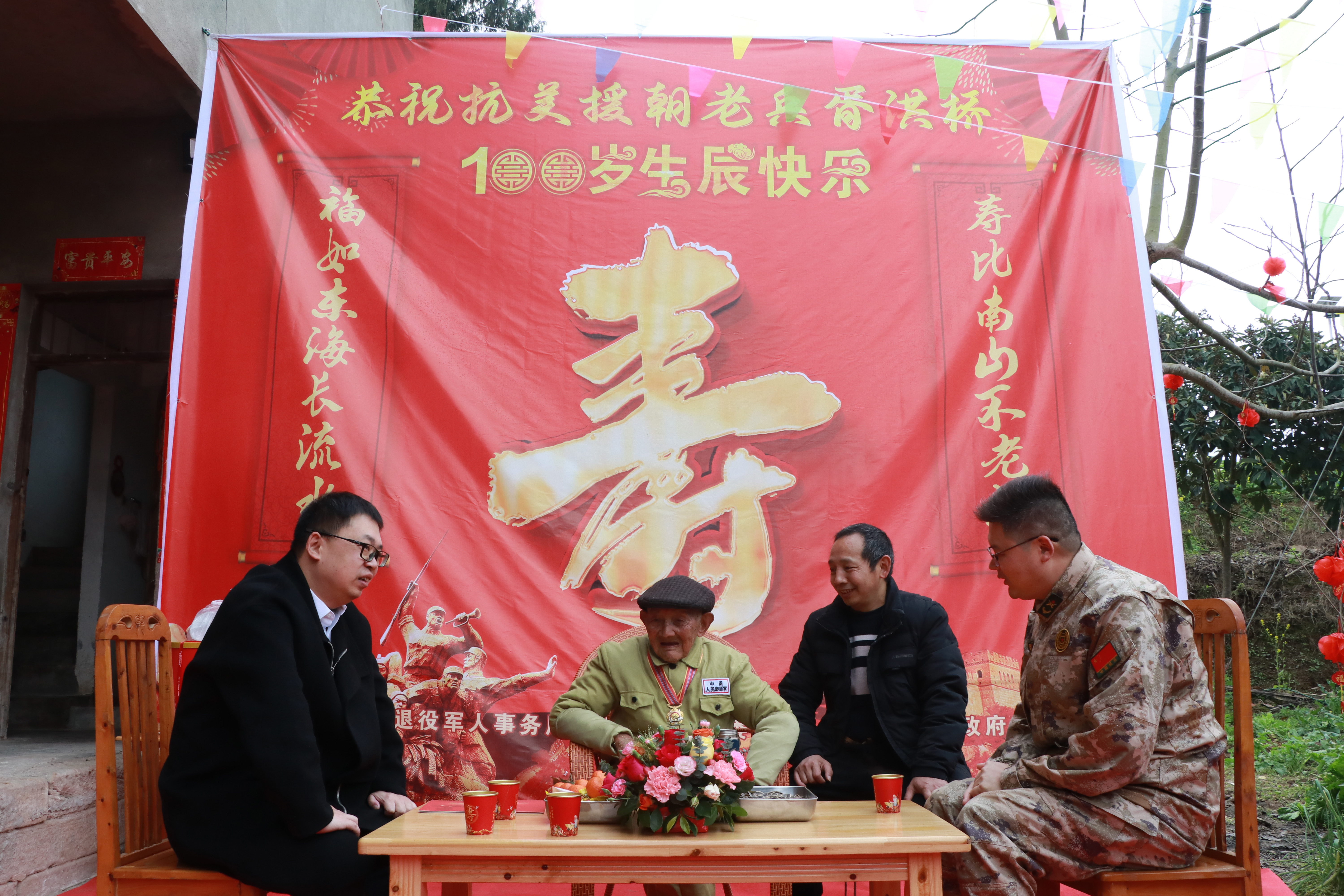 3月13日,抗美援朝老兵胥洪桥迎来了百岁寿辰。射洪市退役军人事务局联合复兴镇人民政府组织慰问团齐聚老兵家中,为他送上鲜花和生日蛋糕,在欢声笑语中一同唱生日歌、吹蜡烛、切蛋糕,共同见证跨越世纪的忠诚与荣光。