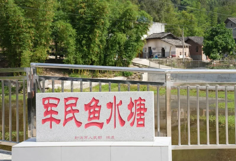新桥村是典型的丘陵山区,地理位置偏僻,海拔相对较高,因常年缺水,农业产业落后。在走访期间,唐杨向人武部领导汇报了军分区帮扶的工作经验;经过讨论,修建“军民鱼水塘”,既满足灌溉用水,又发展养殖产业的思路很快形成。“人武部投入了几十万为我们修了这个水塘,加固了12米长的堡坎,安装了护栏,对塘底进行了防水处理,还对周边路面进行了硬化。用水、养殖、通行都保障了,可谓‘一箭三雕’。”村支书胡丰说起水塘的妙用,脸上挂满笑容。