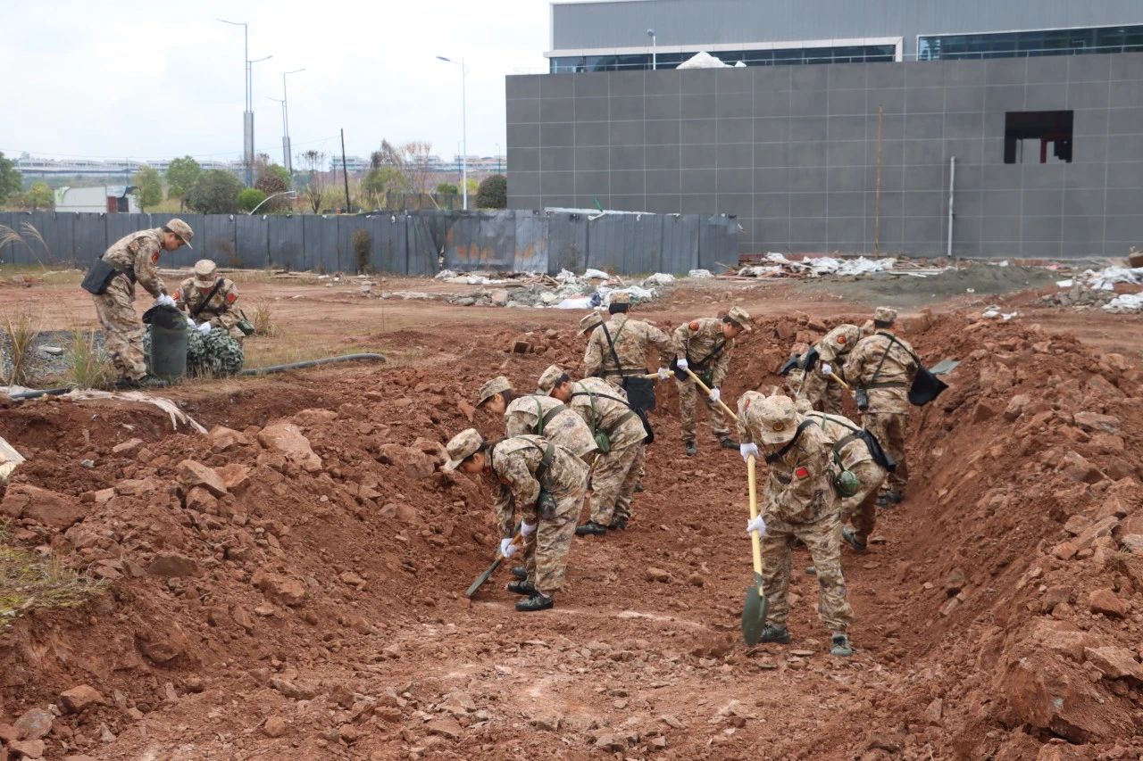 本次演练以实战任务为背景,设有工事构建、隐蔽伪装、野战炊事、外围警戒四项内容。挖掘机、装载机等工程机械迅速高效构筑露天观察工事;指挥所、指挥车、大型车辆利用伪装网和就便植物进行隐蔽伪装;外围哨位对活动区域及重要目标进行巡逻警戒;炊事班利用现地资源,充分发挥野战炊事、热食前送的保障能力,高质量完成百余人伙食保障……演练现场紧张有序,忙而不乱。