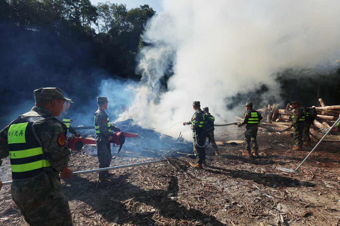 到达任务地域后,指挥员迅速作出情况判断,下达任务分工口令:一班用油锯、割灌机迅速切割形成隔离带;二班利用灭火弹、灭火器、风力灭火机、水泵扑打火源,三班……整个行动过程紧张有序,在全体官兵共同努力下,圆满完成演练任务。