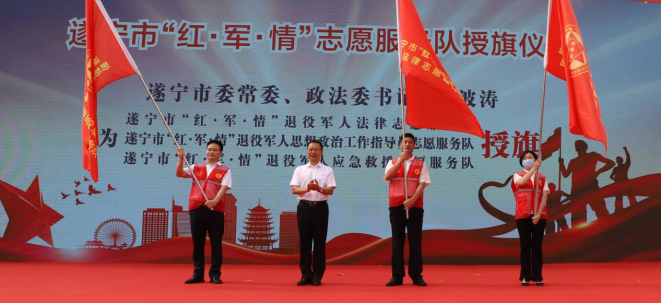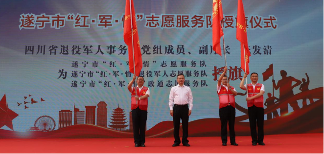 省退役军人厅党组成员、副厅长陈发清为遂宁市“红·军·情”志愿服务队、遂宁市“红·军·情”退役军人志愿服务队、遂宁市“红·军·情”政通志愿服务队授旗并讲话,市委常委、政法委书记刘波涛为遂宁市“红·军·情”退役军人思想政治工作指导员志愿服务队、遂宁市“红·军·情”退役军人法律志愿服务队、遂宁市“红·军·情”退役军人应急救援志愿服务队授旗。市政府副市长张智勇致辞。