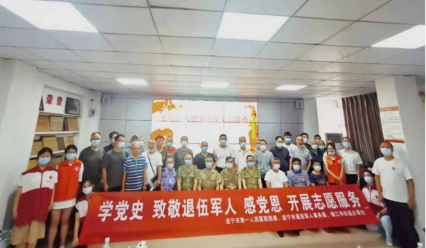 在“八一”建军节来临之际,遂宁市第一人民医院联合遂宁市退役军人事务局、船山区镇江寺街道办事处,于2021年7月26日开展了“学党史 致敬退役军人”志愿者活动。