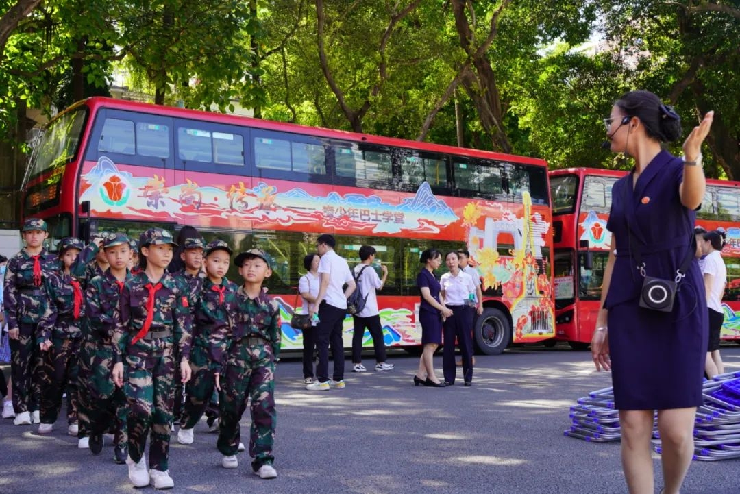 最好的教育是实践,最生动的课堂在路上。广东省广州市创建了“崇尚·传承”青少年巴士学堂研学项目,以公交为载体,基于少先队组织开发青少年参观研学、社会实践、志愿服务、爱心公益等活动,将青少年熟悉的地标“搬”到双层巴士上,并增添红色教育新元素,打造青少年传承英烈文化、赓续红色血脉的创新之举。