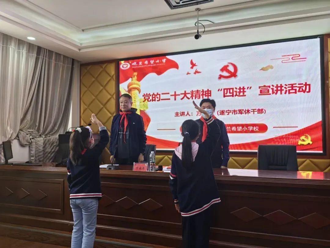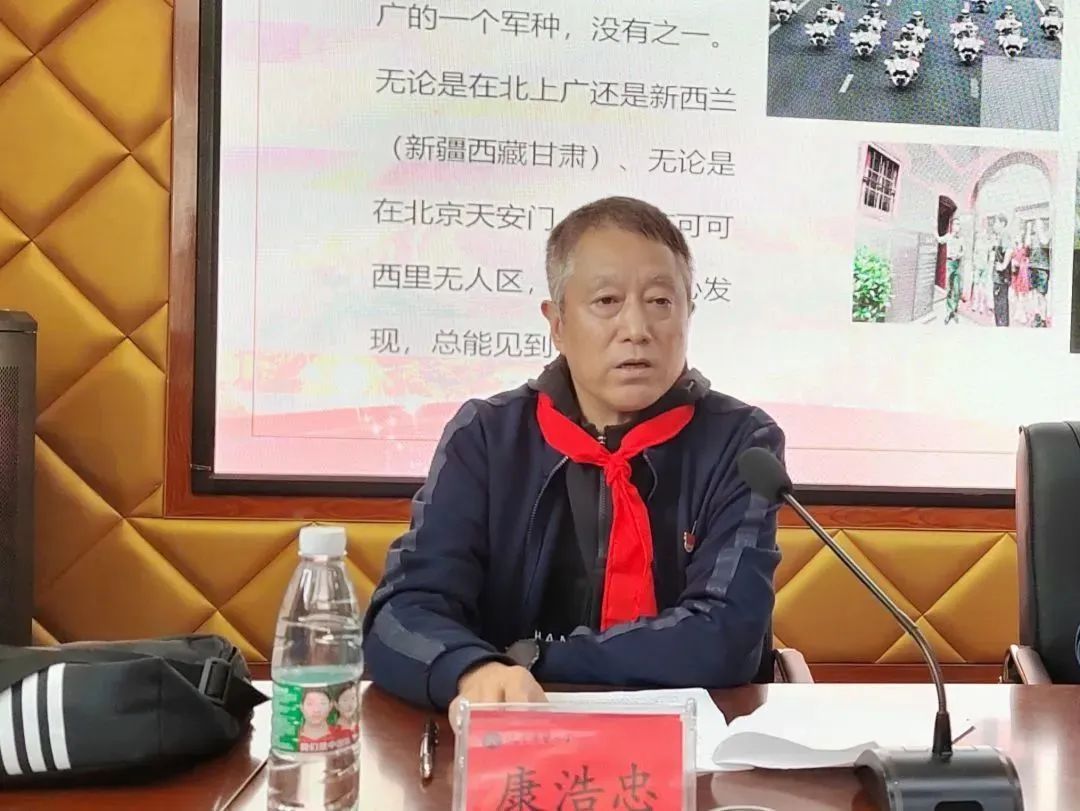 活动现场,晓兰希望小学少先队员为两位军休干部庄重系上红领巾,并致以少先队礼。两位军休干部结合图文并茂、内容充实的宣讲课件,用通俗易懂的话语为学生们讲述军旅生涯中的红色革命故事,用生动的革命故事宣传军人舍小家为大家、投身报国、不惧牺牲的大无畏革命精神,教导学生明白幸福生活来之不易,要努力学好本领,成为对祖国对社会有用之人。