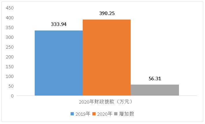 2020年财政拨款390.25万元(包含上年结转10.22万元)。与2019年相比,收支总计各增加56.31万元,增长率16.86%,主要原因是业务量增加,人员增加导致基本支出增加。