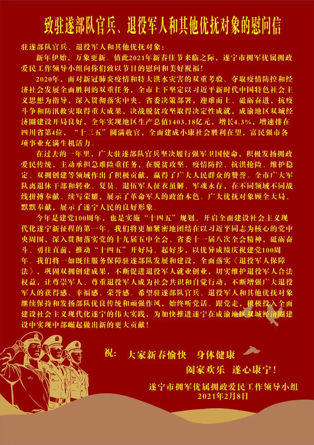 遂宁市双拥工作领导小组致驻遂部队官兵、退役军人和其他优抚对象的慰问信