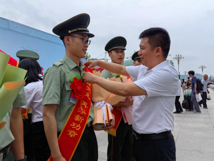 资阳退役军人事务局主要负责同志为首批返乡退役军人代表献鲜花、戴红花、披绶带