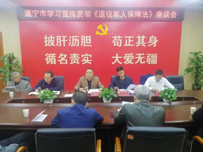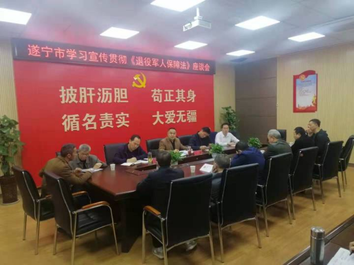 3月29日上午,遂宁市退役军人事务局组织全市部分企业军转干部、在职军转干部、自主择业军转干部、复员干部、下岗失业转业志愿兵(士官)、退役士兵等退役军人代表召开座谈会,学习宣传贯彻《退役军人保障法》,听取他们对贯彻落实《退役军人保障法》和退役军人工作的意见建议。市退役军人局党组书记、局长肖舰参加座谈会并讲话,党组成员、副局长梁腾飞主持会议。